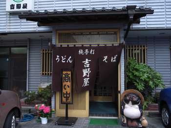 ・千葉の取材に行った時に埼玉県の中原博志選手(加須在住)から美味しいうどん屋さんを教わりました。今日はお休みだったのでちょっと車で出かけてみました。 ・東武伊勢崎線の加須駅から歩いてそんなにかからないところにあるのが、中原選手のお勧めの『吉野屋』です。よしのやって聞くとすぐ牛丼を思い出しますが、うどんとそばの専門店です。 ・お店は住宅街の中にあってちょっと見つけにくい感じですが、大きな暖簾がかかっているのが目印です。お昼の時間から大分遅く訪れたのですが、次から次にお客さんが入ってきます。ここがいかに人気のお店であるかがすぐに分かります。 ・それではお店に入って見ましょう!