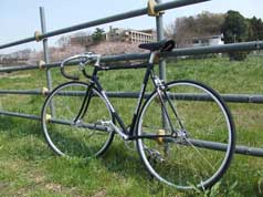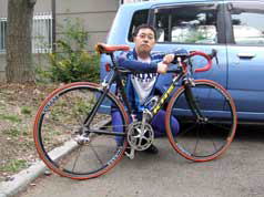 これが以前に大宮競輪場でオークションで手に入れたレーサーです。 これは埼玉の田仲剛選手のフレームなんです。 大体、身長も同じくらいなので、サイズは合っているんじゃないかと思ってます。 u ギヤはかなり軽めにしてあります。 前のギヤの歯の数が46枚で後ろ側が15枚。 ギヤ比は3・06くらいです。(一回、前のギヤを回しきると後輪が約3回転するということです ) プロは選手の脚質よるけど大体3・57とか大きいギヤで4回転で走っています。 しかし、プロでも練習ではギヤを下げて練習するみたいです。