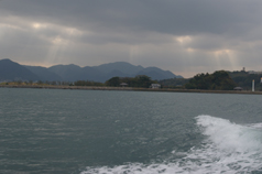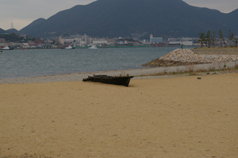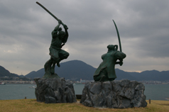 そして、いよいよ上陸。たくさんの観光客で賑わっているのではないかと思っていたんですが、季節的な要因もあるのでしょうか。全く人がいなかったのにはとても驚きました。 l桟橋から少し歩いていくと武蔵と小次郎の決闘の場所をイメージして作られた浜辺には武蔵が乗ってきた小船が再現されていたりしていました。さらにこの海岸を望むようにある小高い丘の上には関門海峡を背景に武蔵と小次郎の決闘の様子の像があって一層雰囲気を盛り上げていました。