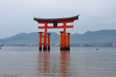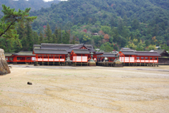 さて、夜は雨が降っていたのでライトアップされていた厳島神社の見学はやめました。朝には心配していた雨も止んで(雲は多いが・・・)何とか傘を差さずに観光できる状態であったので一安心。まずはあまりにも有名な景色をカメラにパチリ!ちょうど潮が引いていくところで、鳥居の辺りがやっと水に浸かっている感じでした。今度は逆に鳥居側から神社方向へカメラを向けて撮ってみました。この厳島神社の風景はいつ来て見ても本当にいい眺めです。