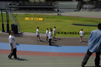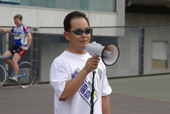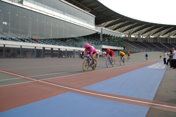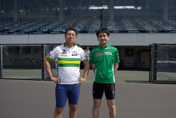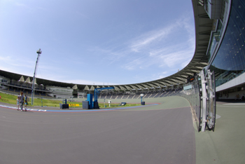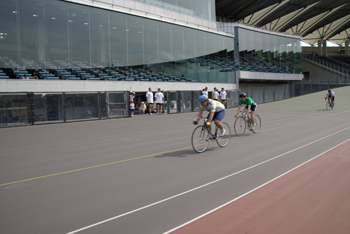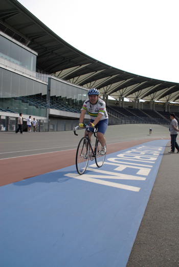 さて、そろそろ自分達も走ってみようと思います。 ・前に大宮バンクは走った事があるので”大丈夫だろう”って安易に考えていたんですが、いざ走って見ると感じが全然違うのにびっくり。 ・特に内と外では全然走るのに使う力が違うということ。大宮以上に外を踏み続けるのはキツイっていうのが正直な印象でした。確かに西武園は捲りが効きにくいといいますが、なるほどと思わず納得します。 ・暫し、福田記者とともにバンク走行を楽しみました。ただ、暑さが影響してか、普段の練習不足がたたってかは分かりませんがいつの間にか脚が一杯になってしまい早々に切り上げてしまいました(情けない・・・)。しかし、400バンクの感触を確かめられたのはとてもいい体験でした。