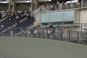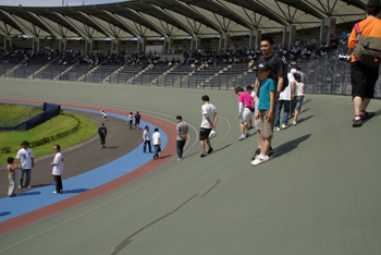 まず西武園クラブ代表で田渕浩一さんの挨拶があった後、参加者全員でバンクを歩くことに。 ・以前は大宮バンクを走ったりしたことがありますが、やはり500バンクと400バンクではカントが違います。一番傾斜があるセンターではちょっとした壁って感じがしました。しかし、選手の話によると、まだこれでも(傾斜は)浅いとの事。 ・バンクの一番上から下を除くとこんな感じ(写真右)に映ります。下を歩いている人がちょっと小さく見えるくらいです。この高さを走り抜けるんですから驚きですよね。