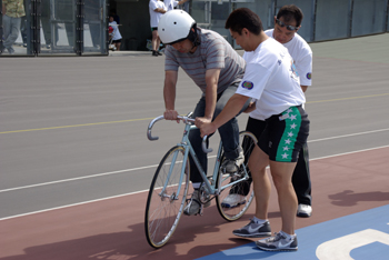 今回のイベントでは西武園クラブのホームページで告知されていましたが、誰でも参加自由でした。 ・自転車経験ありの人から家族連れ、はたまた車券好きのファンまで様々な人が参加しました。 ・自転車を持ち込めなかった人にも貸し出しが行われました。さらに普段体験できない競技用自転車にも乗ってもらおうとピストレーサーの乗車体験もありました。 ・子供から大人まで初心者に対しては西武園クラブ所属の選手たちが丁寧にアシストして皆が自転車を楽しめる雰囲気を作ってくれました。 ・これには皆、満足。バンクを走り終えると思わず笑顔がこぼれます。