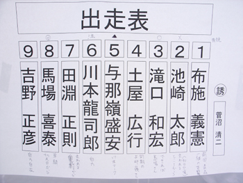 一通り、バンクの走行体験が終わった後に西武園所属の選手たちによる競輪模擬レースが行われる予定となっていました。 ・大変用意がよくてなんと出走表まで用意してありました!そして参加者がそれぞれ勝者を決めて投票をするといったイベントが行われることに。 ・出走選手がそれぞれ出走表の下にコメントを出して(誰々は自力だとか何々にマークだとか)います。それを見て田渕さんや吉田英二さんに印を打ってくれって言われてちょっと困りましたが、僕なりの渾身の印を打ちました(笑)。本来なら池崎選手本命なのですが、本人が言うには欠場90日というので、前期S級を務めていた馬場選手に期待して本命としました。 ・さあ、レースを見てみましょう!