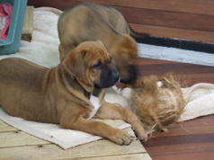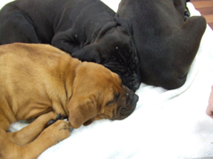 ている犬のほうが生後2ヶ月で、三匹で仲良く寝ているのが生後4ヶ月だそうです。闘犬になるには雄の犬ではないといけないとのこと。しかもすべての犬が闘犬にはなれないそうで、気性的に弱かったりしてもいけないしとのこと。「闘争心」が大事なんだそうです。